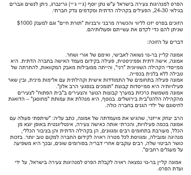 פרס "תורת חיים" למנהיגות צעירה בישראל – על שם נתן יוסף (ג׳יי. ג׳יי.) גרינברג הזוכה לשנת תשע"ט היא: אמונה קליין בר נוי